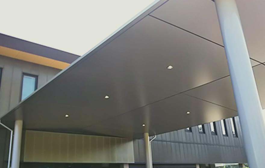 所在地 愛知県一宮市 施工数量 約235㎡ 施工内容 庇ハニカムパネル(LEDライン照明内蔵)の取付工事 -